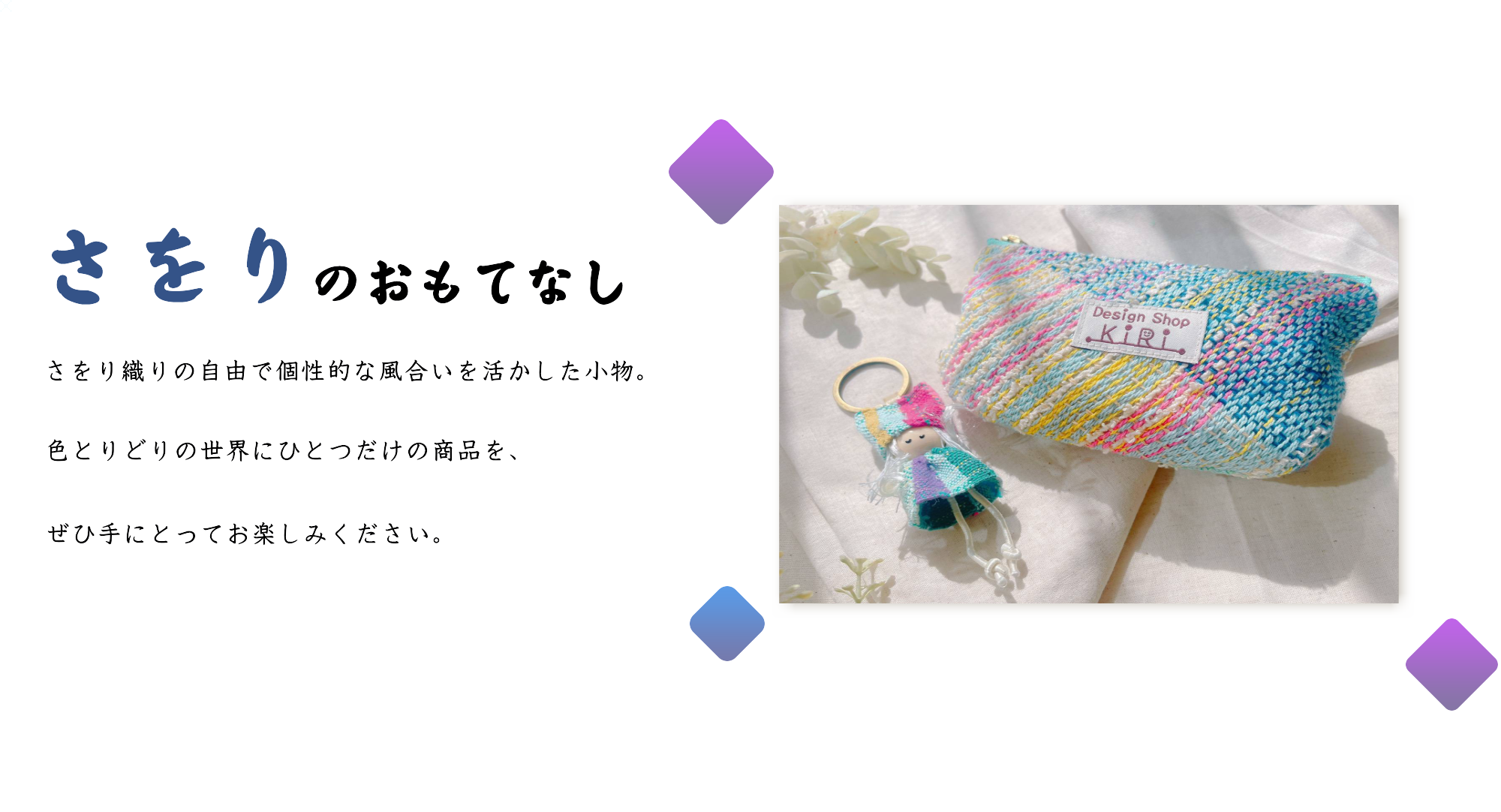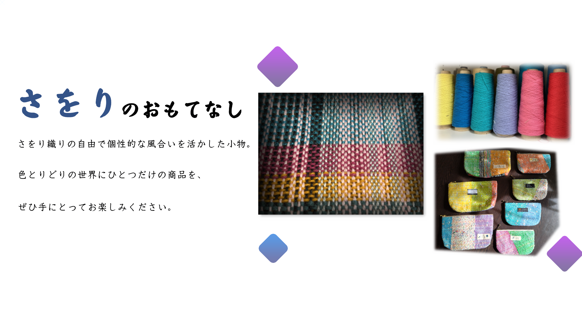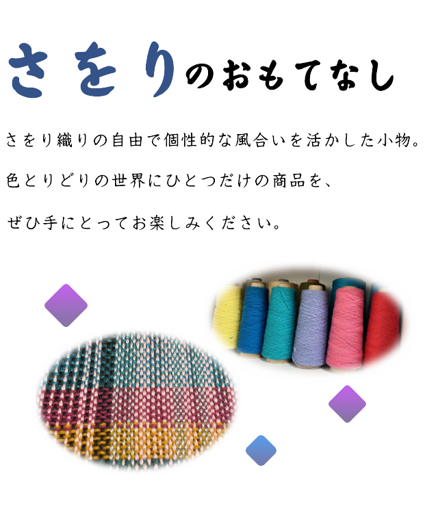 自由な色づかいと温かみのある風合いが魅力のさをり織り。 ポーチ、髪飾りをはじめ、日常にそっと彩りを添える小物たちを取りそろえています。 一点ずつ異なる表情を持つ“世界にひとつ”の手織りアイテムをお楽しみください。。